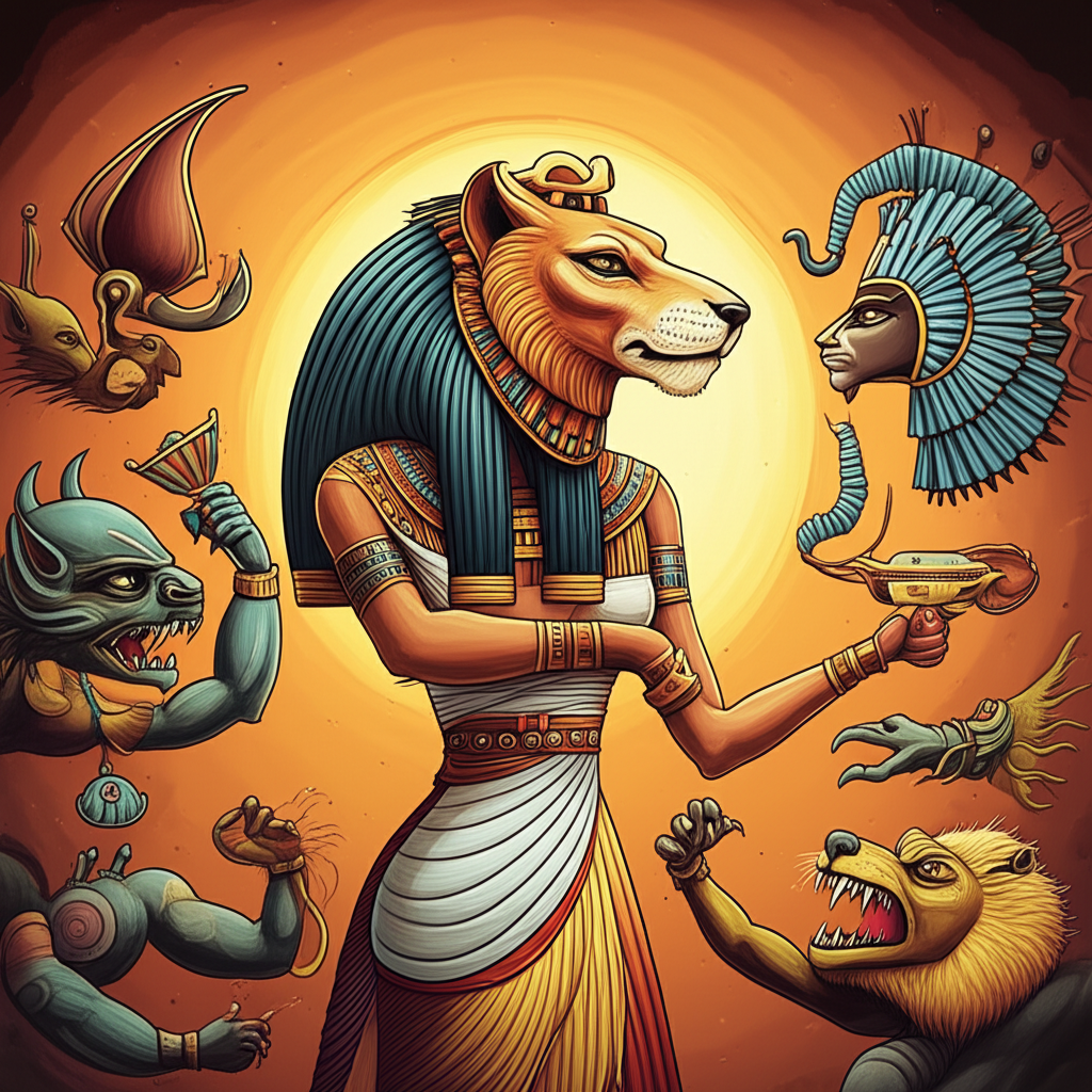 From Ra’s eye, a fierce power was unleashed, transforming into Sekhmet. Her lioness head roared, and she descended to Earth, a whirlwind of destruction. She rampaged through the land, her fiery breath consuming all who opposed her. The rivers ran red with the blood of the unrepentant. Soon, the entire world was gripped by fear, and the remaining humans sought refuge.