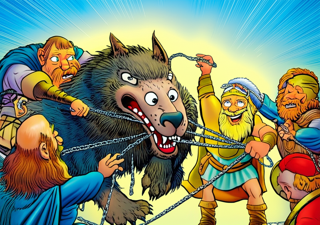 Meanwhile, the gods had to deal with Fenrir, whose immense size and uncontrollable power was a growing threat. They knew that if left unchecked, he would bring about Ragnarök, the end of the world. They tried to bind him, but his strength was such that he shattered every chain they forged. First, they crafted a strong chain called Læding, but Fenrir broke it easily. Next, they tried Dromi, which was even stronger, but Fenrir still burst through it.
